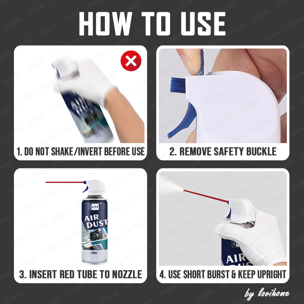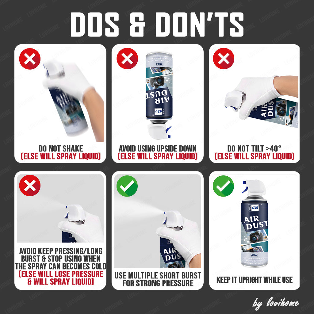 🚀 For optimal performance, use the can in short bursts while keeping it upright. This helps slow the freezing process of the can, ensuring more consistent results. Always turn off any electronic devices before cleaning to prevent static discharge and ensure safety. We are not responsible for any misuse or damage caused by improper handling of the product.