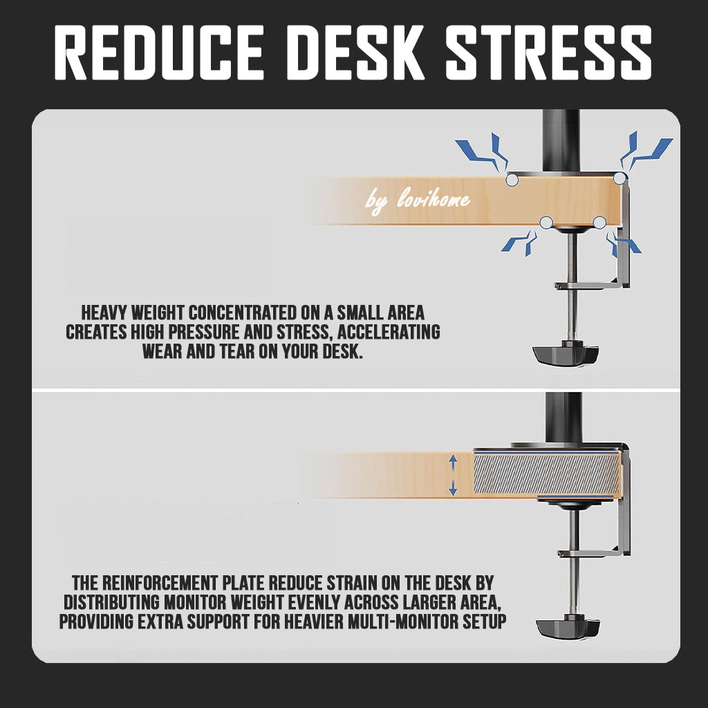 š REDUCE DESK STRESS - Heavy weight concentrated on a small area creates high pressure and stress, accelerating wear and tear on your desk. The reinforcement plate reduce strain on the desk by distributing monitor weight evenly across larger area, providing extra support for heavier multi-monitor setup